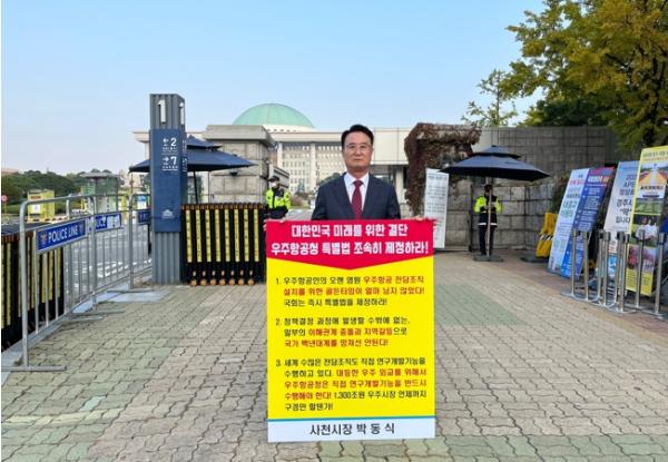 박동식 사천시장은 23일 오전 8시 국회 앞에서 ‘우주항공청 특별법의 조속한 국회 통과를 촉구’하는 1인시위를 벌였다.
