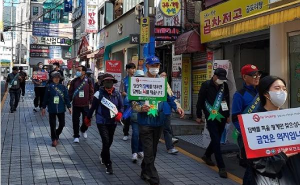 부산금정시니어클럽 회원 및 부산가톨릭대학교 간호학과 학생들과 함께 금연 구호를 외치며 행진하고 지역주민과 부산대 인근 상가를 대상으로 공중이용시설이 금연 구역임을 홍보하고 흡연의 폐해와 금연의 필요성을 알렸다.