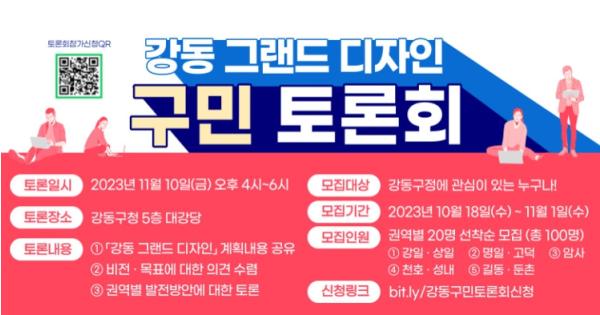 토론회 참가를 원하는 주민은 11월 1일까지 신청 링크(bit.ly/강동구민토론회신청) 또는 QR코드를 통해 온라인으로 신청하면 되고, 5개 권역(①강일·상일 ②명일·고덕 ③암사 ④천호·성내 ⑤ 길동·둔촌)에서 각 20명씩 총 100명을 선착순 모집한다.