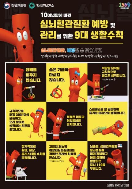 횡성군보건소장은 “심뇌혈관질환 예방을 위해서는 평소 9대 생활 수칙 실천하고 정기적으로 심장 건강과 혈압, 혈당, 콜레스테롤 수치를 확인하는 습관을 가지는 것이 중요하다.”라며, “또한 겨울철 외출 시 보온을 신경 써 갑작스러운 체온 변화에 대비해 주시기를 당부드린다.”라고 전했다.