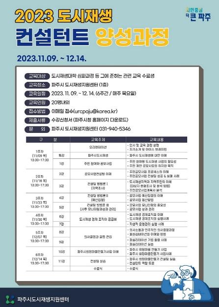 파주시는 11월 6일까지 ‘2023년 파주시 도시재생 컨설턴트 양성과정’ 참여자 20명을 모집한다.