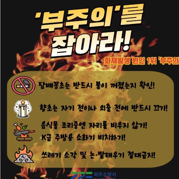 소방서에 따르면 최근 3년간 파주시에서 화재로 인한 인명피해 중 사망자가 13명이 발생했으며, 화재원인은 담배꽁초로 인한 부주의 화재 50%, 음식물 조리 25%, 기타 부주의 25%로 나타났다.