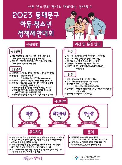 동대문구는 ‘2023 동대문구 아동?청소년 정책제안대회’에 참가할 아동?청소년을 오는 27일까지 모집한다고 밝혔다.