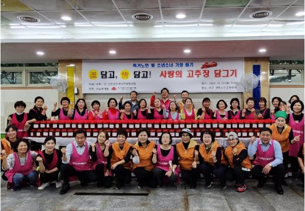 인천 서구 여성단체협의회가 ㈜남부개발로부터 이웃사랑 성금 5백만원을 후원받아 23일 서구 연희노인문화센터에서 다문화 가정과 함께 ‘사랑의 고추장 담그기’ 행사를 진행했다.