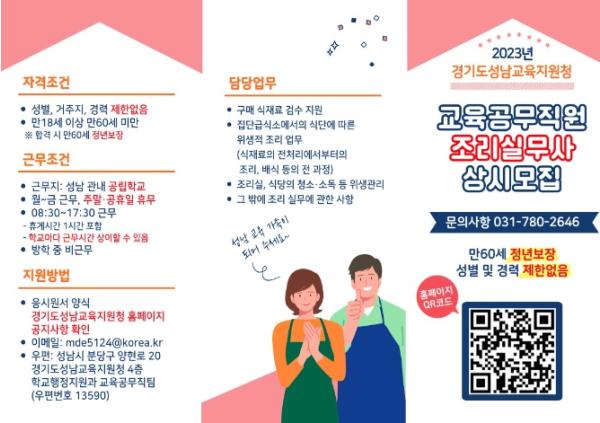 경기도성남교육지원청은 오는 26일 성남시청 1층 누리홀에서 열리는 ‘2023 성남시 채용박람회‘에 참가한다. 박람회에서 공립학교 조리실무사 60여명을 채용할 예정이다. 이번 채용박람회는 올해 성남시에서 개최되는 가장 최대 규모의 대면 채용 행사로 50여개 기업도 참여한다.