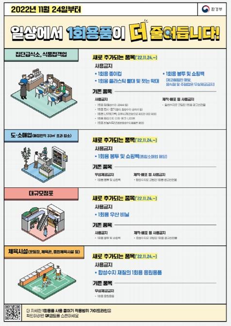 식품접객업과 집단급식소 매장 내에서는 종이컵·플라스틱 빨대·젓는 막대를 사용할 수 없으며 식품접객업에서는 1회용 봉투 및 쇼핑백 무상제공이 금지된다. 또한 백화점 등 대규모점포에서는 우산 비닐을 사용할 수 없다.