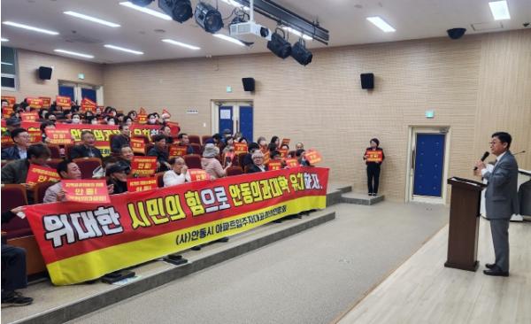 아파트 입주자대표회의 구성원(임원, 동별 대표자 등) 150여 명이 안동시 공동주택 운영 교육을 위해 모인 가운데 핸드배너를 들고 의대 유치를 염원하는 구호를 외치며 간절함을 호소했다.