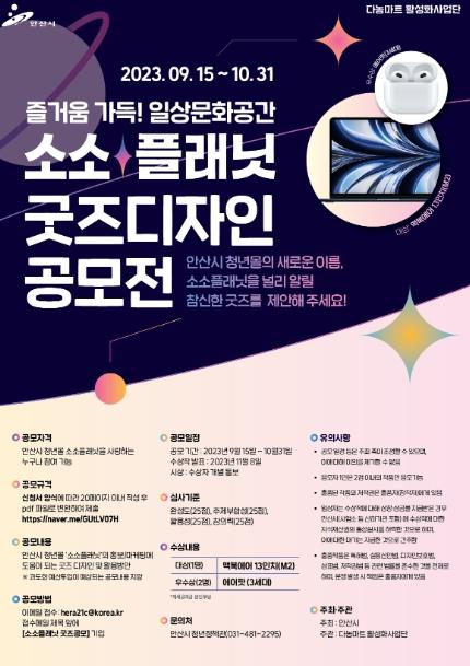안산시는 청년몰의 새로운 브랜드명인 소소플래닛을 알리기 위해 ‘소소플래닛 굿즈디자인 공모전’을 진행한다고 25일 밝혔다.