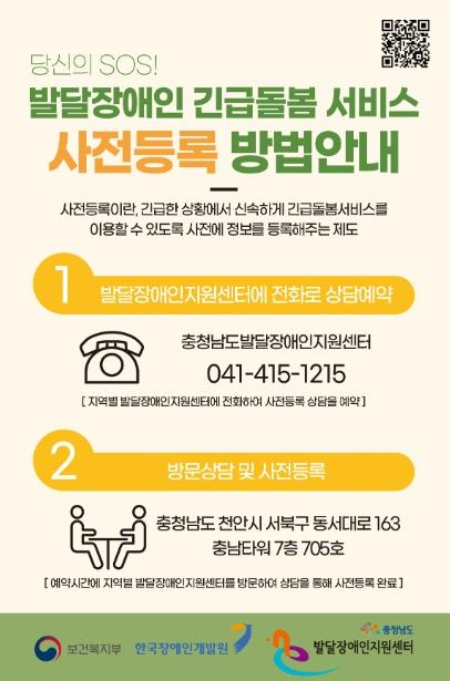 발달장애인 긴급돌봄사업 사전등록과 사전체험을 희망하는 경우 충청남도발달장애인지원센터로 전화 또는 방문(천안시 서북구 동서대로 163)해 상담을 받을 수 있다.