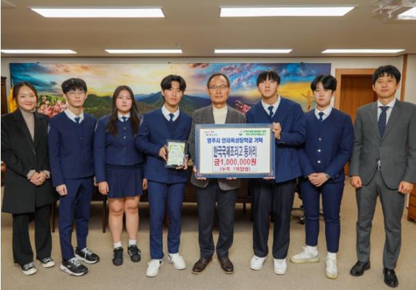 (재)영주시인재육성장학회는 24일 한국국제조리고등학교 조리 동아리 학생들이 영주시청을 방문해 장학금 100만 원을 기탁했다고 밝혔다.