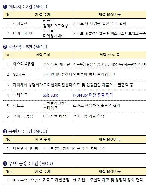 에너지 분야에서는 삼성물산과 카타르 경제자유구역청 간 카타르 내 태양광 발전 수주 협력을 위한 양해각서와 함께 발전 네트워크 협력 등 총 2건의 양해각서가 체결됐다. 이에 따라, 우리 기업들이 카타르가 추진 중인 2030년 재생에너지 비중 20% 확대에 기여할 것으로 기대된다.