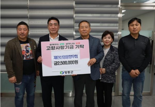 재안산영동군민회가 고향사랑 기부제에 동참했다. 재안산영동군민회는 지난 26일에 영동군을 방문해 직접 250만원의 기부금을 전달했다.