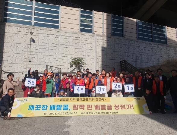 지난 20일 배밭골 상인회, 통장 및 직능단체, 대학생 봉사단, 지역 주민, 성북구청 청소행정과, 정릉3동 주민센터 등 약 60여 명이 참석하여 쌀쌀해진 날씨에 따뜻한 온기를 더했다. 이날 참여자들의 배밭골 상점가 골목길과 이면도로, 쓰레기 무단투기 지역 청소로 한층 깨끗한 상점가로 바뀌었다. 골목 구석구석에 쌓인 담배꽁초, 일회용 용기, 잡풀, 낙엽과 쓰레기 무단투기 지역의 가방, 의자, 우산 등 오랫동안 방치된 크고 작은 쓰레기들을 모두 청소했다.