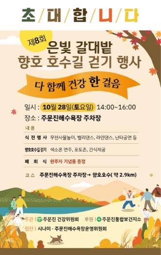 아름다운 향호호수와 은빛 갈대밭을 걸으며 성큼 다가온 가을날의 정취를 만끽할 수 있는 '제8회 은빛갈대밭 향호호수 건강 걷기' 행사가 오는 28일 오후 2시 주문진해수욕장 주차장에서 개최된다.