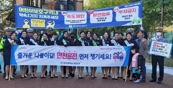 대구 달서구는 25일 아침 진천동 대형원시인석상 앞 상화로와 대진초등학교 주변도로에서 교통사고 예방을 위한 가을 행락철 교통안전 캠페인을 실시했다.