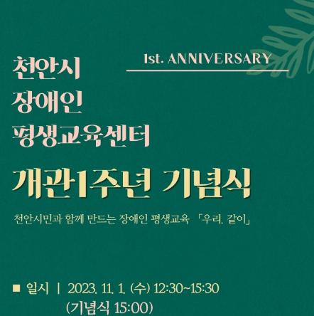 개관 1주년 기념행사는 ‘천안시민과 함께 만드는 장애인 평생교육 우리, 같이’를 주제로, 센터 운영 결과를 알리고 천안의 장애인 평생교육의 통제탑으로서 센터가 나아가야 할 방향을 지역사회와 공유하는 자리로 마련된다.