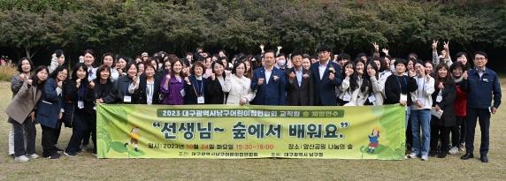 대구광역시 남구청은 지난 24일, 앞산공원 나눔의 숲에서 관내 어린이집 보육 교직원 100여명을 대상으로 숲체험 연수를 실시했다고 26일 밝혔다.