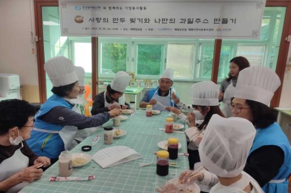 한전MCS 직원 27명은 15시 혜명양로원에서 어르신 14명, 아동 14명과 모둠별로 만두를 빚고, 직접 다듬은 과일로 나만의 주스를 만들어 먹었다.