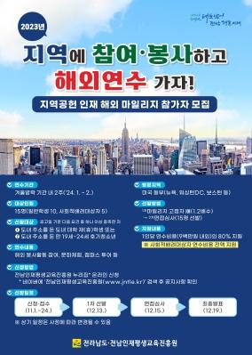 전라남도는 2023년 지역공헌 인재 해외 마일리지 참가자를 11월 1일부터 24일까지 모집한다고 밝혔다.
