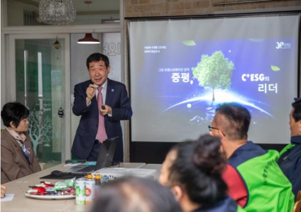 이재영 군수가 26일 자원순환시민센터를 방문해 탄소중립과 관련한 주제로 주민들에게 특강을 펼쳤다.