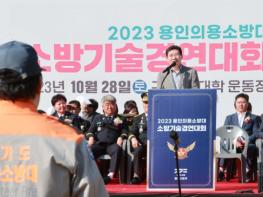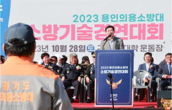 이상일 용인특례시장이 28일 기흥구 언남동 (구)경찰대학교 운동장에서 열린 ‘2023년 용인의용소방대 소방기술경연대회’에 참석해 소방 가족들을 응원했다.