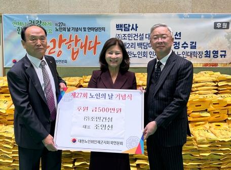 인제군 북면 소재 조민건설는 지난 26일 북면실내체육관에서 개최된 ‘제27회 노인의 날 기념행사’에서 지역 어르신들을 위한 쌀(5kg) 312포(500만원 상당)를 후원했다.