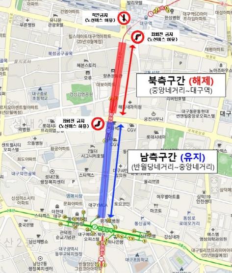 이번에 조정(대중교통전용지구 해제)되는 구간은 중앙로 북편구간(대구역네거리~중앙네거리, L=0.45㎞)으로 그동안 시내버스 외에는 차량 통행이 제한됐으나, 이번 조치로 모든 차량 통행이 허용된다.