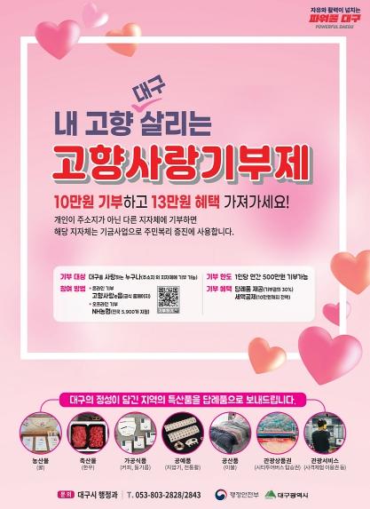 대구광역시는 고향사랑 기부자에게 감사를 전달하고 대구의 매력을 널리 알릴 수 있는 우수한 답례품을 선정하기 위해 2024년 고향사랑기부제 답례품과 공급업체를 공개 모집한다.