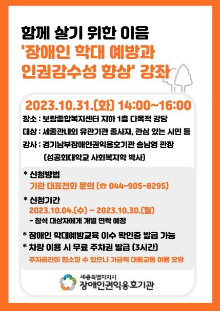 세종특별자치시가 세종시장애인권익옹호기관과 공동으로 오는 31일 보람종합복지센터 다목적강당에서 ‘장애인 학대 예방과 인권감수성 향상’을 위한 시민강좌를 개최한다.