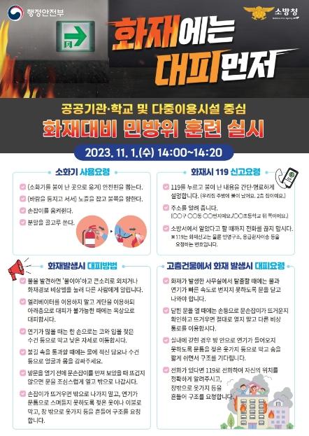 가상 화재 발생에 따른 화재 발생 신고, 상황전파 및 대피 등 대응훈련으로 진행되며, 유도요원의 안내에 따라 건물 밖이나 대피장소로 신속히 이동 후 화재 시 국민행동요령, 심폐소생술 등의 교육이 진행될 예정이다.