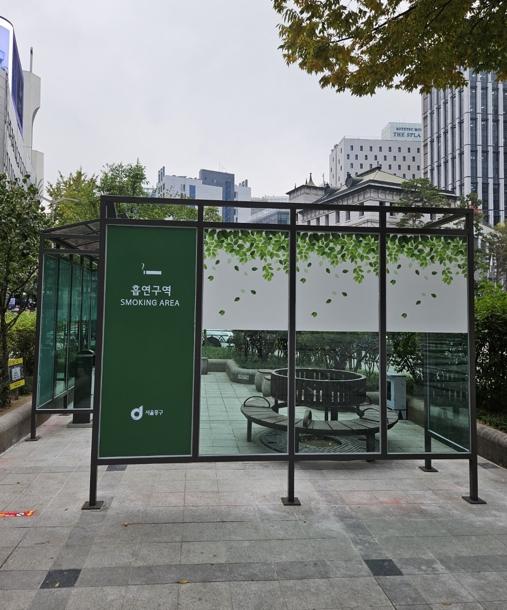 서울 중구가 지난 25일 한국은행 앞 광장쉼터 일대에 새로운 디자인의 ‘개방형 흡연 부스’를 시범 설치했다.
