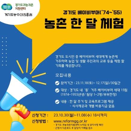 경기도 베이비부머 농촌 한 달 체험은 도시에 거주하는 베이비부머 세대(1974~1955년생) 귀농·귀촌 준비자가 실제 농촌 이주 전에 희망 지역에서 한 달간 미리 거주하면서 영농실습, 지역민 교류 등을 체험할 수 있도록 임시주거지와 교육프로그램을 지원하는 사업이다.