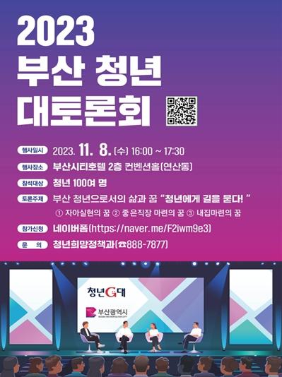 부산시는 오는 11월 8일 오후 4시, 부산시티호텔 컨벤션홀에서 '2023 부산 청년 대토론회'를 개최한다고 밝혔다.