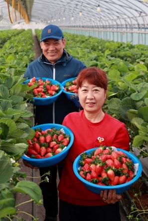 30일 오전 경남 함양군 지곡면 창촌마을 이감성씨 부부가 딸기 하우스에서 새콤달콤한 딸기를 첫 수확한 뒤 들어 보이고 있다.