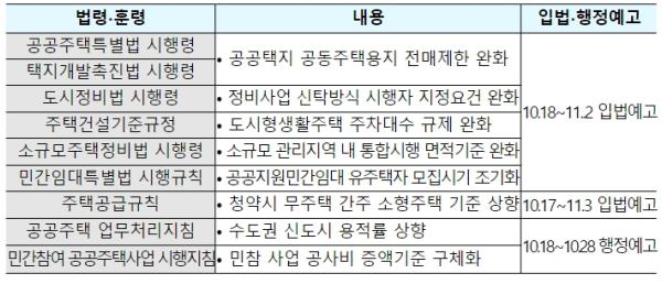 ?주택공급 활성화 방안?에 따른 제도개선 사항(9개 법령?훈령)도 입법?행정예고를 모두 완료(10.17~18)했으며, 단축 입법예고 등 신속한 개정절차를 진행하여 11월 중 시행될 수 있도록 추진할 예정이다.