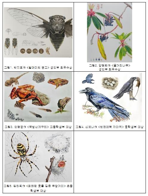 수상작은 성인부 11점과 초중고 학생부 각 12점씩 총 47점이며, △성인부 최우수상 ‘말매미의 경고(박지호 작)’와 ‘굴거리나무(양현희 작)’, △고등학생부 대상 ‘북방산개구리(안현정 작)’, △중학생부 대상 ‘반전매력 까마귀(신예나 작)’, △초등학생부 대상 ‘화려한 옷을 입은 무당거미(김라희 작)’가 선정됐다.