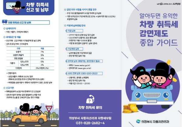 의정부시는 차량 취득세 감면 제도 안내를 위한 종합가이드를 제작해 시청 및 자동차관리과 민원실, 동 주민센터 등에 이번 주 배포한다고 31일 밝혔다.