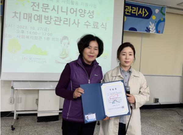 인천계양시니어클럽은 전문시니어양성프로그램으로 6월 7일부터 10월 27일까지 5개월에 걸쳐 주 1회 총 20회기의 ‘치매예방관리사’ 교육을 진행하고 수료식을 실시했다.