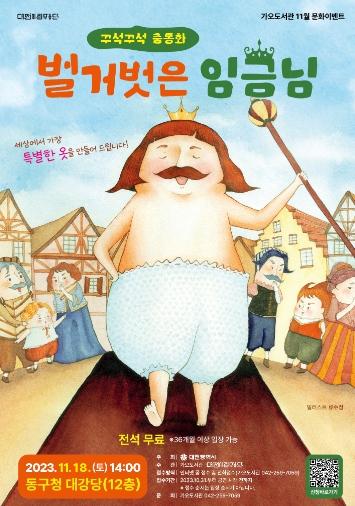 대전 동구는 다음 달 18일 동구청 대강당에서 대전광역시 주최, 가오도서관?대전시립무용단 공동 주관으로 ‘꾸석꾸석 춤동화: 벌거벗은 임금님’ 공연을 개최한다.
