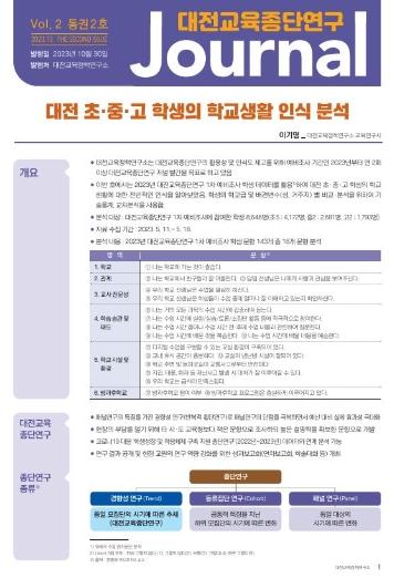 대전교육과학연구원 대전교육정책연구소는 10월 31일, ‘대전교육종단연구 저널’ 통권2호를 대전 관내 모든 초?중?고 학교와 기관에 배부하고 대전교육정책연구소 누리집에 공개(한글판, 영문판)했다고 밝혔다.