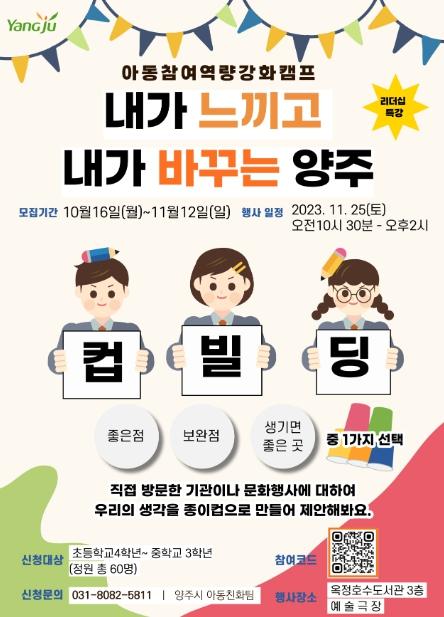 양주시는 오는 11월 12일까지 ‘내가 느끼고 내가 바꾸는 양주, 아동참여 역량강화캠프’의 참여자를 모집한다고 31일 밝혔다.