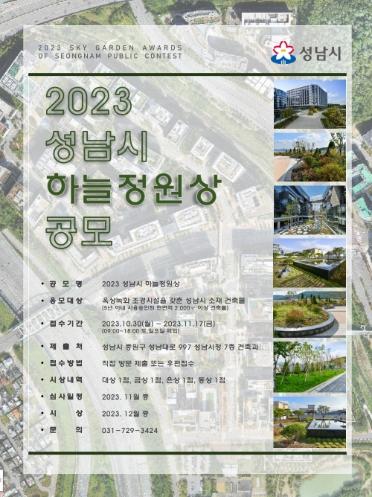 ‘2023 성남시 하늘정원상’은 도시 열섬현상 완화, 도시경관 향상, 냉난방 에너지 절감 및 시민 휴식공간 제공 등의 효과를 실현하고 도시 품격 향상에 기여한 옥상녹화 우수건축물을 선정 및 시상하기 위한 공모다.