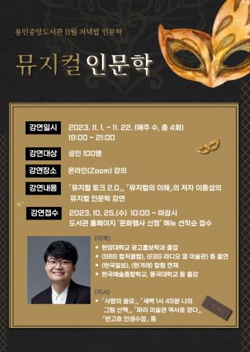 용인특례시 중앙도서관은 시민들의 인문 소양을 넓히기 위해 운영하는 ‘저녁밥 인문학’ 프로그램으로 11월 한 달간 뮤지컬 전문가 이동섭 씨를 초빙해 특강을 연다.