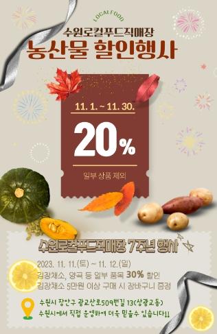 수원로컬푸드직매장이 11월 1일~30일 농축수산물 할인행사를 열고, 11월 11~12일에는 7주년 할인행사를 진행한다.