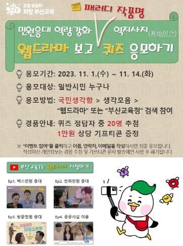 부산교육청은 실제 민원 사례를 토대로 웹드라마를 제작하면 민원 응대에 대한 이해도를 높이고, 공감대도 형성할 수 있을 것으로 판단하고 지난 6월 에피소드 공모에 나섰다.
