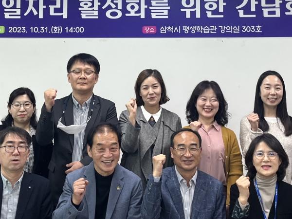 이번 간담회에는 삼척교육지원청, 삼척상공회의소, 한국폴리텍Ⅲ대학, 삼척고용복지플러스센터, 삼척시니어클럽, 삼척시 장애인연합회, 삼척시 지역자활센터, 삼척가정폭력성폭력통합상담소, 삼척가족센터, 삼척청년센터 등 10개 유관기관 관계자가 참여했다.