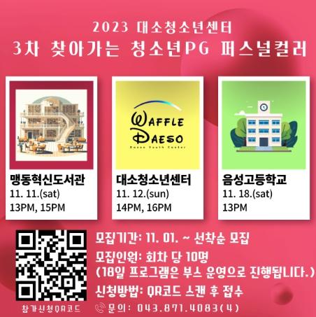 11월 11일(맹동혁신도서관), 12일(대소청소년센터)에 걸쳐 회차당 10명씩 1일당 2회차로 연이어 운영되며, 18일(음성고등학교)은 음성군 청소년수련시설 동아리 발표회에서 부스를 운영할 계획이다.