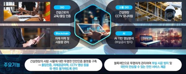 이 서비스는 조작이 불가능한 블록체인 기술을 기반으로, 증명된 현장인력 출입관리, 인증된 자재 이력관리, 폐쇄회로(CC)TV, 사물인터넷(IoT)센싱, 인공지능(AI) 등 통합관제 기술을 아파트 건설 현장에 적용해 투명한 공사관리가 이뤄지게 하는 서비스다. 최근 사회적으로 문제가 된 무량판 구조 아파트 철근 누락이나 건축자재 시험성적서 위?변조 등으로 인한 부실시공 문제 해결을 위해 착안했다.