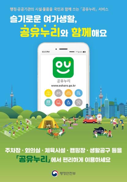 ‘공유누리 서비스’는 전국의 행정기관과 공공기관 등이 국민에게 개방한 시설 물품 서비스 등을 편리하게 활용하기 위해 만든 통합플랫폼으로 공유누리 포털과 모바일 앱을 통해 쉽게 공유자원을 검색하고 이용할 수 있다.