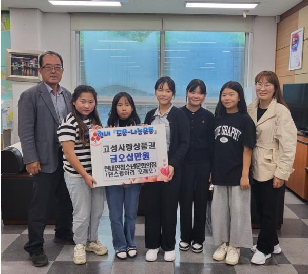 현내면 청소년문화의집 댄스동아리 ‘오래오’는 지난 제23회 고성통일명태축제 청소년동아리 경연대회에서 대상을 수상하고 받은 상금(고성사랑상품권 50만 원)을 지난 11월 1일 현내 도움-나눔 운동에 기탁했다.